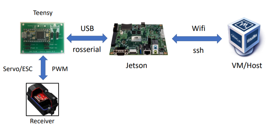 Using our 32 bit linux VM, we will SSH into the Jetson which is the computer on board the vehicle. On the jetson, we will write code which provides instructions to the teensy microcontroller. The microcontroller generates pulse width modulation signals that the receiver on the car uses to move. The duty cyle input to the servo and ESC are what determine how much to throttle and what direction to reverse. We did the calculations to convert duty cycle input to PWM in our code.